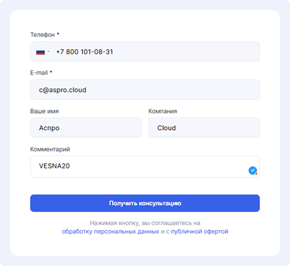 С 14.04.2025 по 30.04.2025 на все услуги Аспро.Cloud действует скидка 20% по промокоду VESNA20.