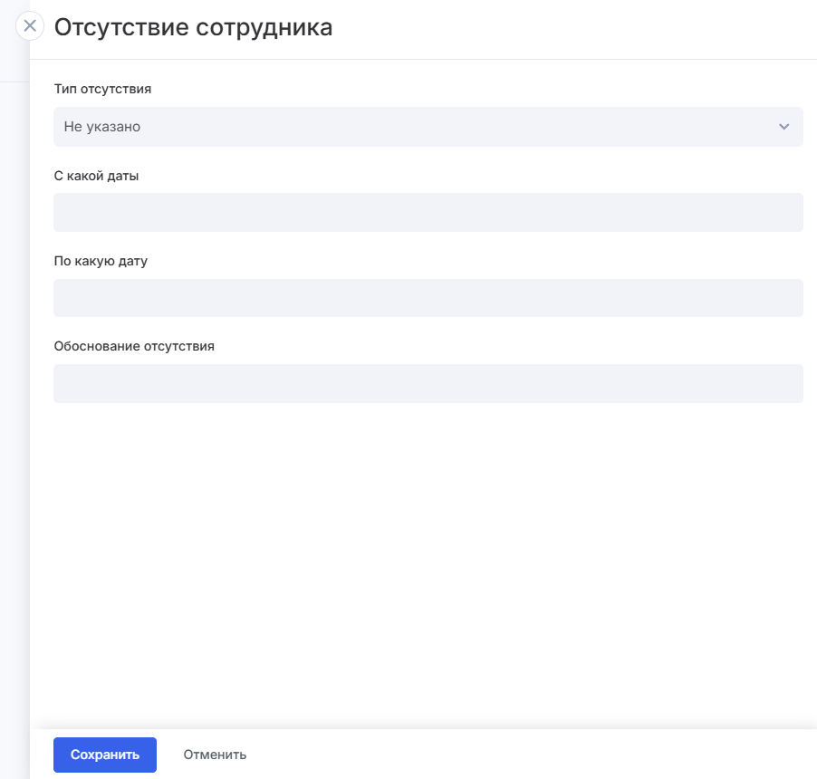 В модуле «Отсутствия» система сохраняет информацию обо всех отпусках, больничных, отгулах и других причинах отсутствия сотрудников.
