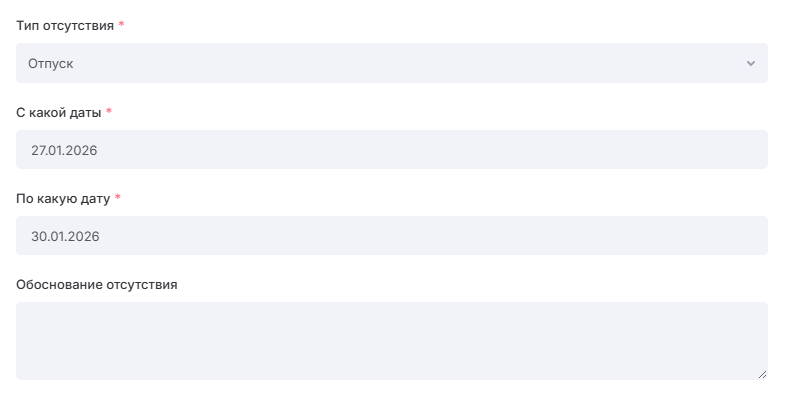 Для остальных типов отсутствий, таких как отпуск и больничный, обоснование не нужно |