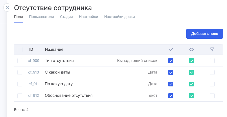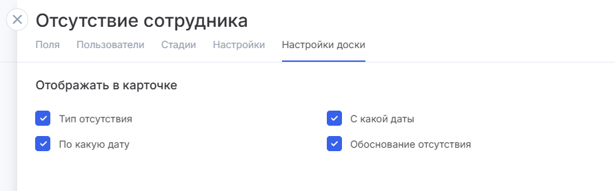 Во вкладе «Настройки доски» также находятся поля, которые будут отображаться в запросе на отсутствие.