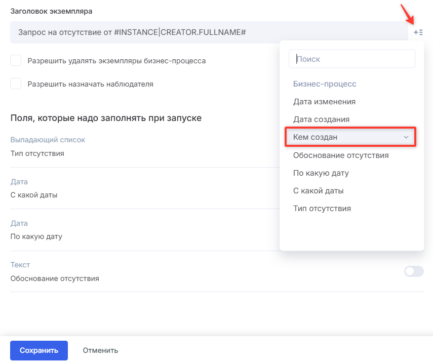 Напишите в поле «Запрос на отсутствие от» и нажмите на кнопку справа. Выберите формулу «Кем создан». Теперь вместо формулы будет появляться имя и фамилия сотрудника, который отправляет запрос на согласование.