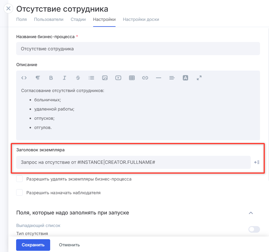 Переходите во вкладку «Настройки». Здесь находится название и описание бизнес-процесса, которые вы вводили в начале. В блоке «Заголовок экземпляра» можно настроить автоматическое название запроса. Сюда можно подставить переменную. Например, имя сотрудника, который отправил запрос.