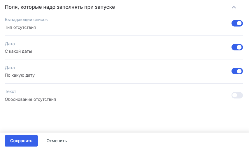 В блоке «Поля, которые нужно заполнять при запуске» можно выбрать обязательные для заполнения поля. Включите ползунок, чтобы активировать нужное поле. Нажимаем «Сохранить».