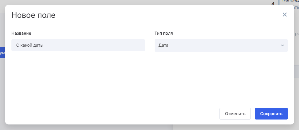 Нажмите кнопку «Добавить поле». В открывшемся окне напишите название, например, «С какой даты». Также выберите тип поля, то есть то, что сотрудник будет вводить. Для нашего примера подойдет тип «Дата». Нажмите «Сохранить».