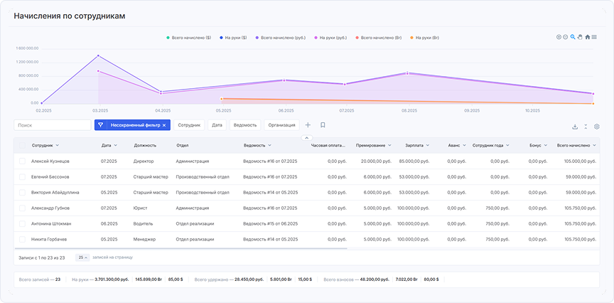 С его помощью вы сможете вести учет начислений по заработной плате. Благодаря интеграции с 1С, вы сможете импортировать в Аспро.Cloud список сотрудников, информацию о существующих видах начислений, а также формировать зарплатные ведомости.