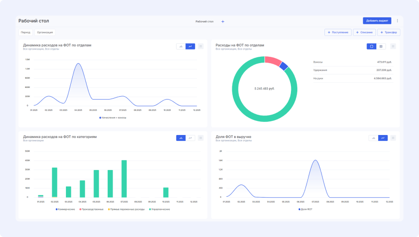 Вместе с модулем вы также получаете набор из шести информативных виджетов для рабочего стола Аспро.Cloud. Они помогут вам мгновенно выявлять отклонения от нормы, находить точки роста и принимать более взвешенные решения для управления финансами.