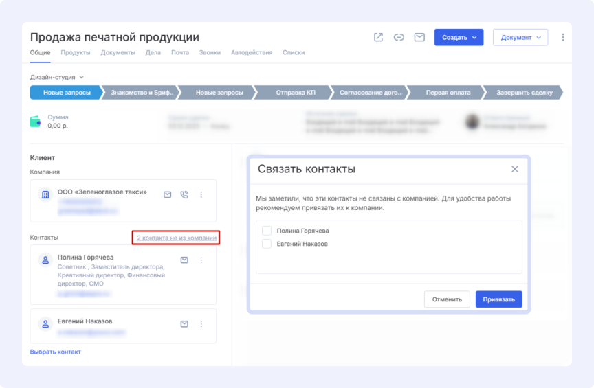 Если вы ведете сделку сразу при участии нескольких сотрудников компании-контрагента, поставщиков и/или партнеров, их всех можно будет привязать к сделке. Больше не придется создавать дубли для каждого из контактов.