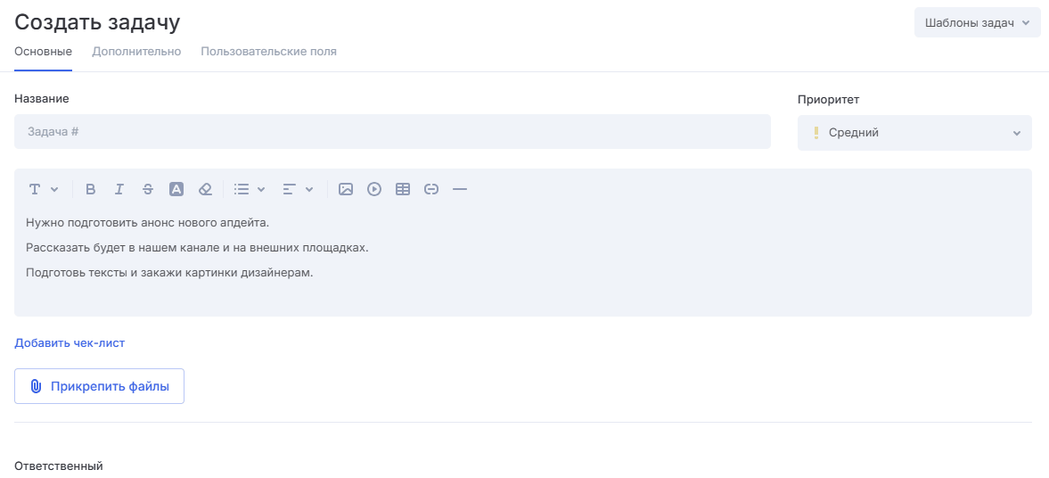 В Agile-модуле и модуле «Задачи» теперь доступен новый более удобный текстовый редактор. Интерфейс стал более минималистичным. Кроме того, текст теперь делится на блоки-абзацы, порядок которых можно менять курсором.