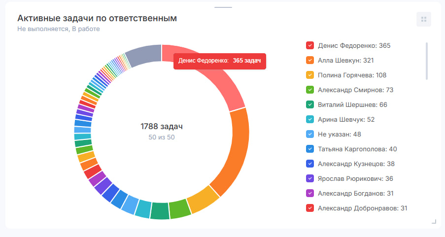 Этот виджет подходит для быстрой аналитики по задачам. В нем выводятся данные в виде диаграммы, которая позволит отслеживать количество задач по заданному признаку, а также плановое или фактическое время их выполнения.