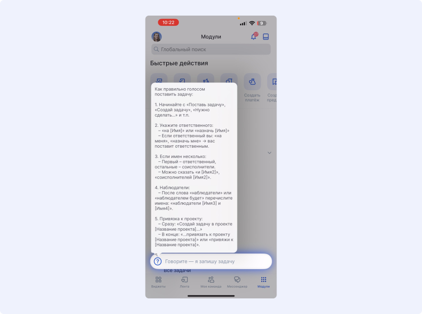 Создавать задачи в мобильном приложении можно еще быстрее и проще. Вместо заполнения полей и настройки связей в интерфейсе, просто начните говорить — встроенный ИИ оформит задачу за вас.