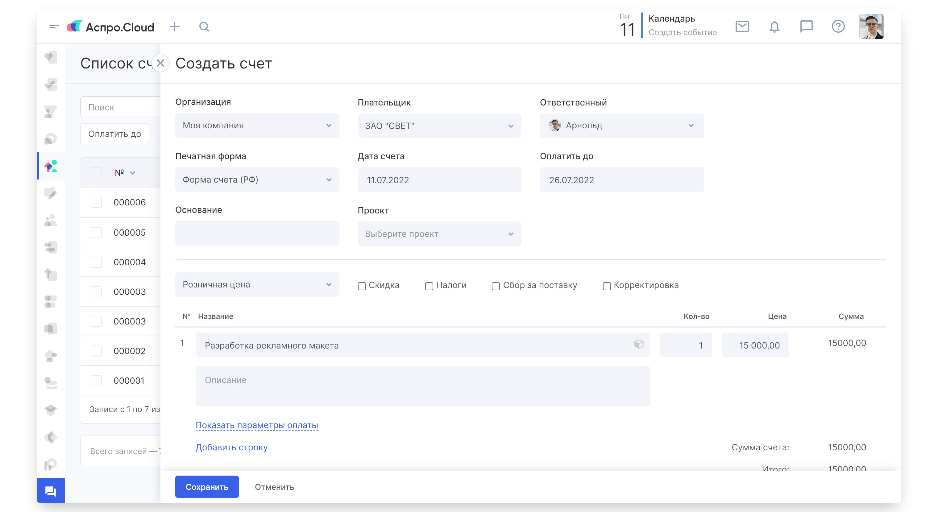 Теперь можем переходить к выставлению счетов по созданному шаблону. Выбираем контрагента из CRM и организацию, если у вас их несколько. Если для организации создано несколько печатных форм счета, то система предложит выбрать нужный. Если счет выставляет не ответственное лицо, а, например, бухгалтер – укажите менеджера. В таком случае он будет получать оповещения в мессенджер обо всех изменениях в счете: поступившие оплаты, комментарии.