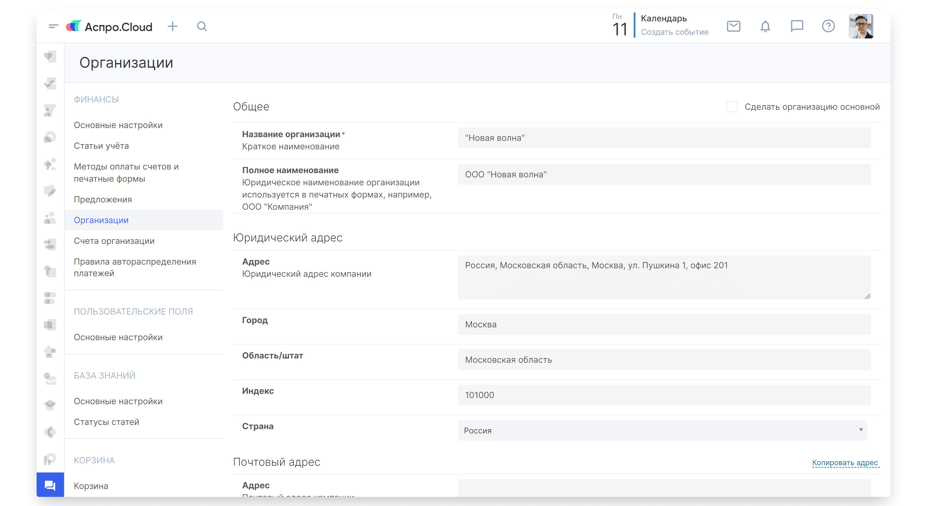 Для начала у вас должны быть созданы одна или несколько организаций, от которых вы планируете выставлять счета. Организации создаются в настройках системы, в одноименном разделе.