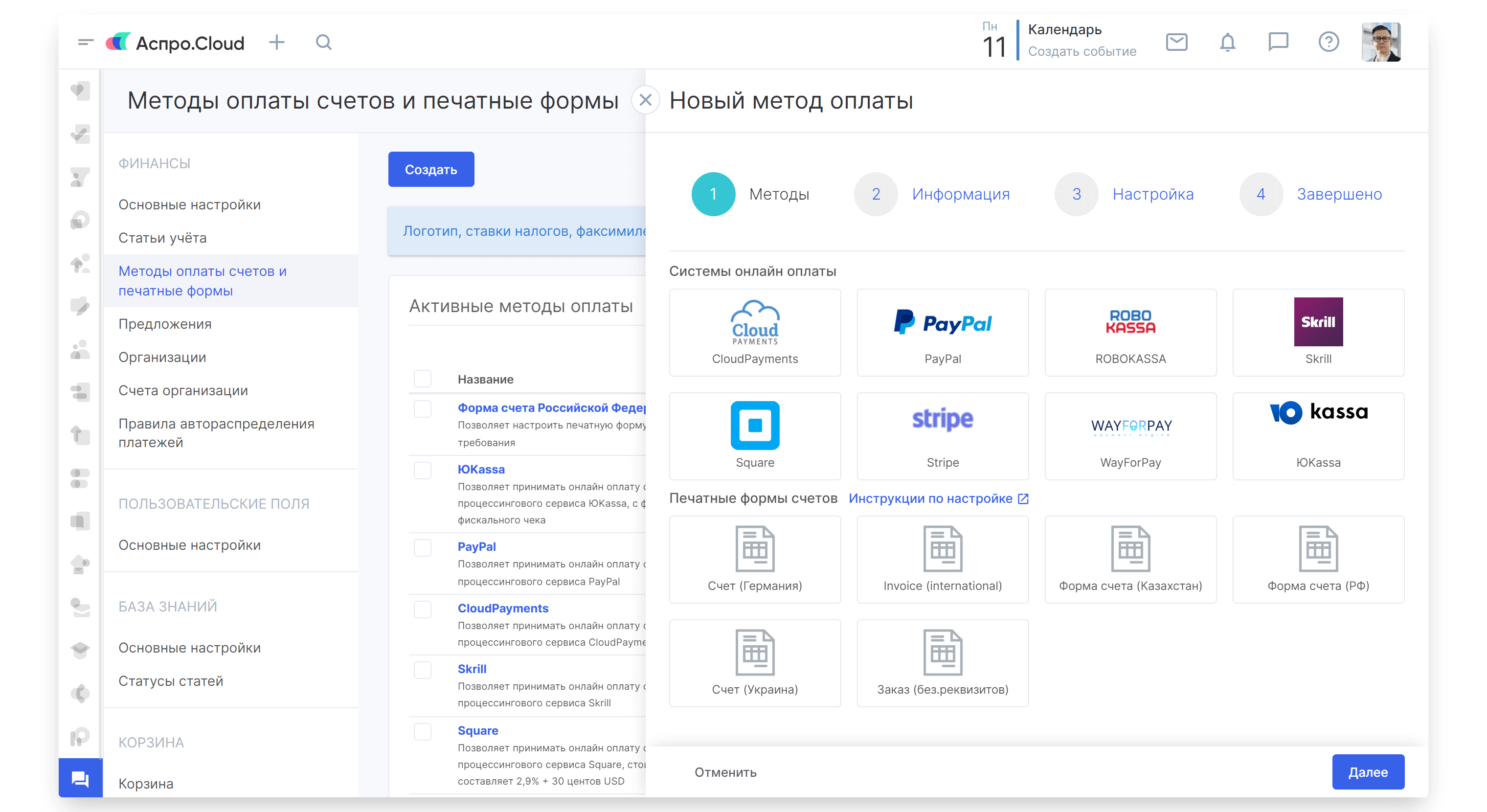 Теперь можем переходить к созданию печатной формы счета. Нам не подходят наименования некоторых полей в счете для РФ, который доступен по умолчанию в системе. Некоторые данные нужно будет изменить. Заходим в настройки системы, открываем пункт «Финансы» → «Способы оплаты счетов» и нажимаем кнопку «Создать». Выбираем «Печатная форма счета для РФ».