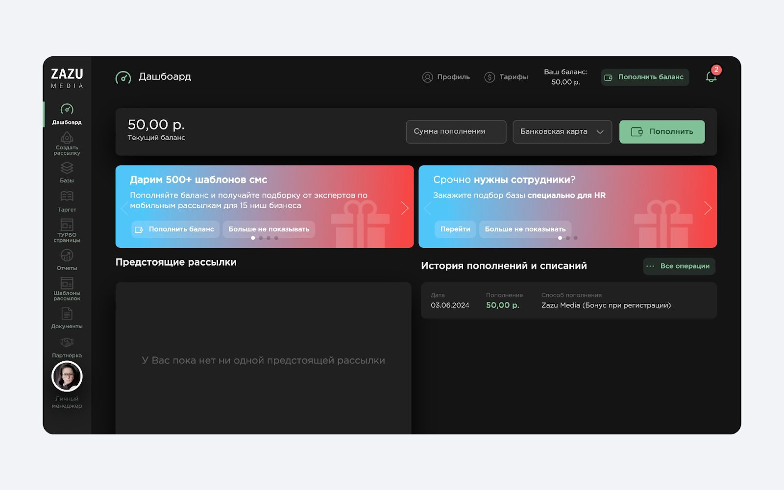 ZAZU MEDIA — платформа для запуска рассылок в мессенджерах и SMS. Дополнительно вы можете заказать рассылку у специалистов сервиса под ключ.
