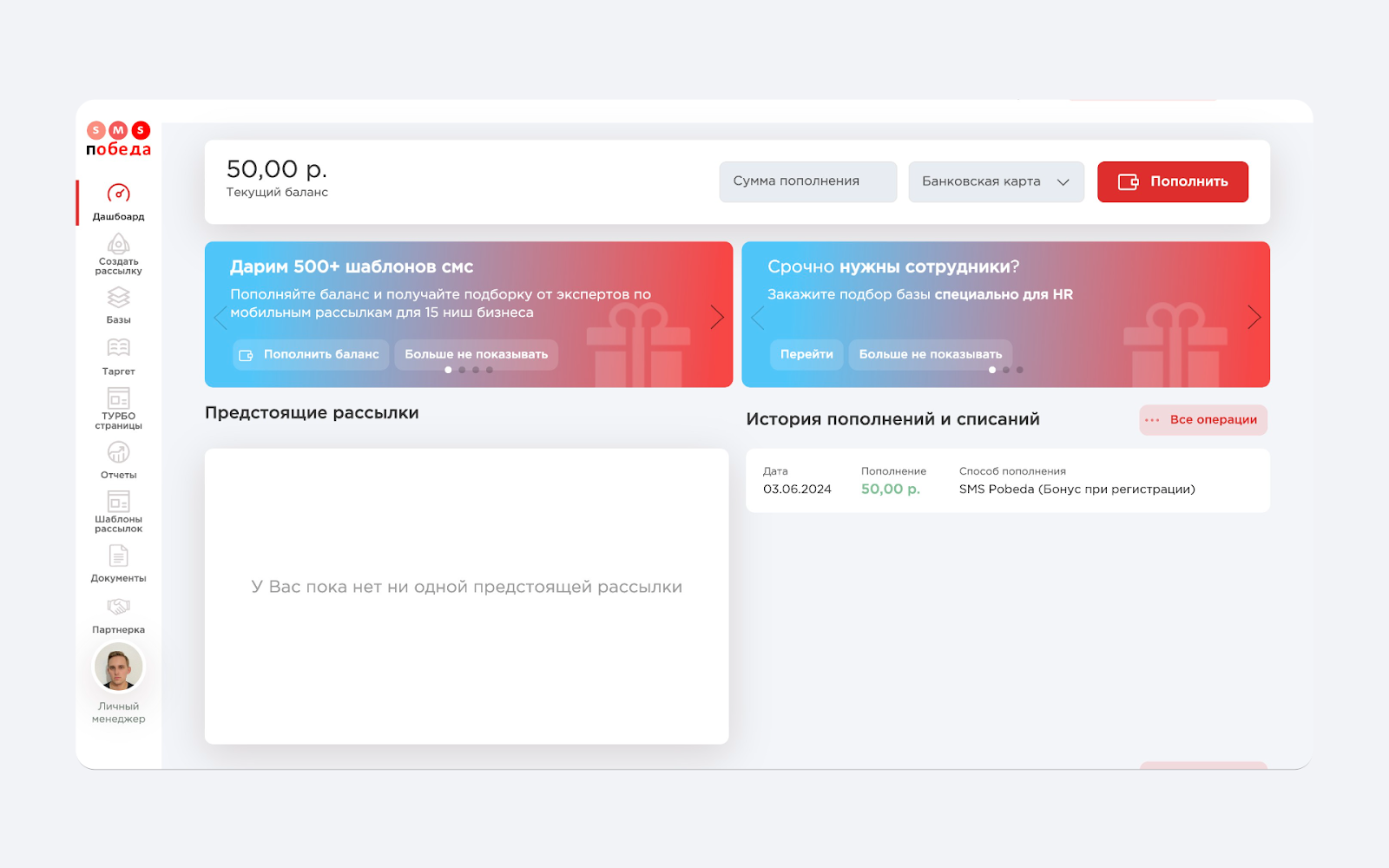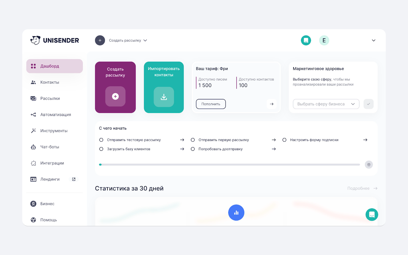 Пробный период: персональный менеджер поможет настроить личный кабинет и запустить первую рассылку.