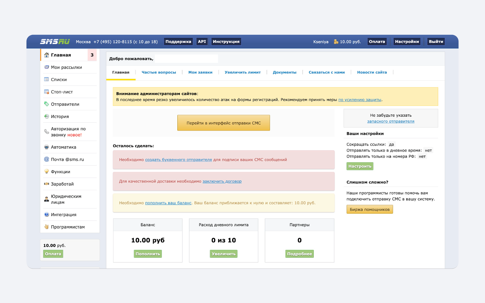 Пробный период — 10 ₽ для использования платформы после регистрации. Также в день сервис предоставляет пять бесплатных SMS на ваш номер.