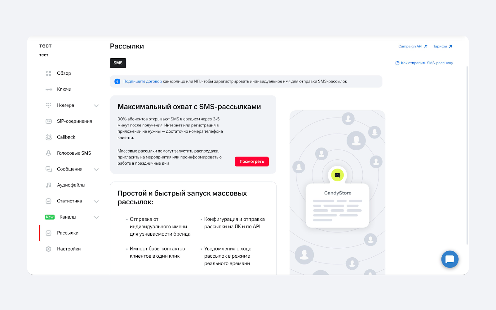 Интеграция — сервис предоставляет API, с помощью которого вы сможете интегрировать приложения рассылки SMPP и HTTP.