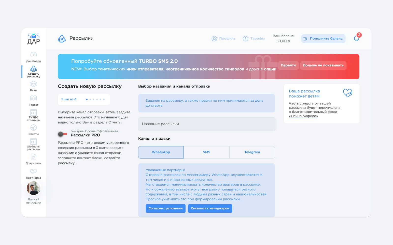 «SMS Дар» — сервис со своей базой контактов в 30 млн абонентов для массовых рассылок SMS, WhatsApp, Telegram, Viber. Вы оплачиваете только доставленные сообщения — если уведомление не пришло, стоимость не спишется, а база автоматически обновится.