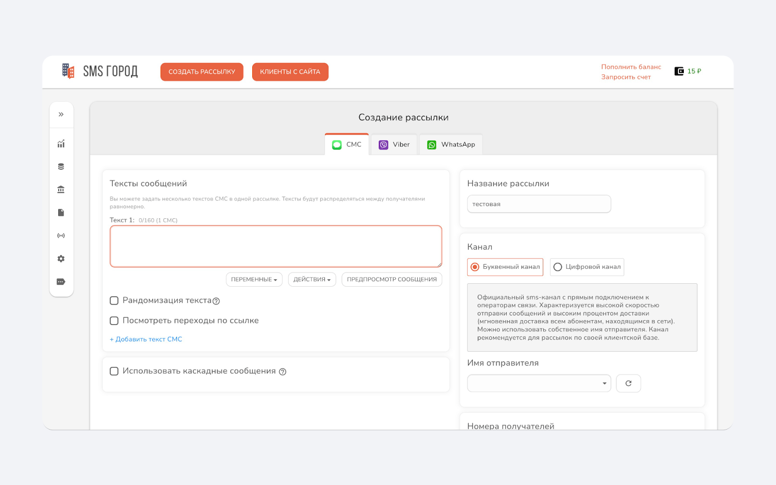 Мультиканальная рассылка — отправляйте сообщения по SMS, на электронную почту и в мессенджеры.