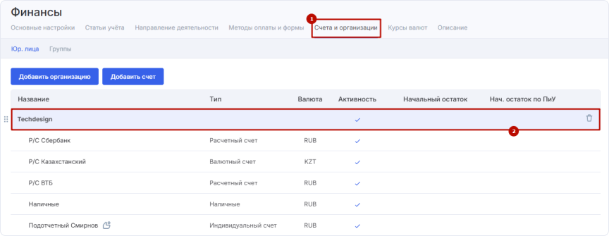 Откройте подраздел «Счета и организации» (1) и выберите ту организацию (2), для которой хотите изменить ставку налога. В отличие от расчетных счетов, названия организаций выделены жирным шрифтом.
