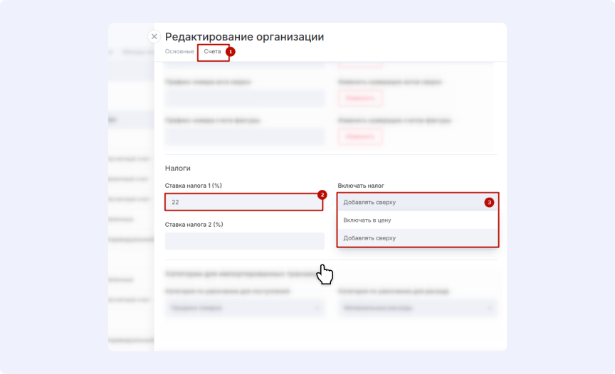 - выберите способ учета налога (3) — добавлять поверх цены или включать в нее;