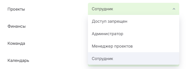 Раздайте коллегам права доступа к тем модулям, с которыми связана их основная деятельность. Например, менеджеру по продажам достаточно будет доступа к сделкам, контрагентам и, возможно, проектам, а бухгалтеру — к «Финансам».