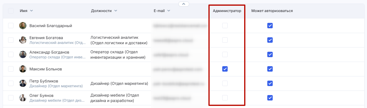 Обратите внимание, что по умолчанию администратором портала в Аспро.Cloud является пользователь, который его изначально зарегистрировал. Если это сделал сотрудник, который не входит в руководящий состав компании, организуйте процедуру передачи прав.