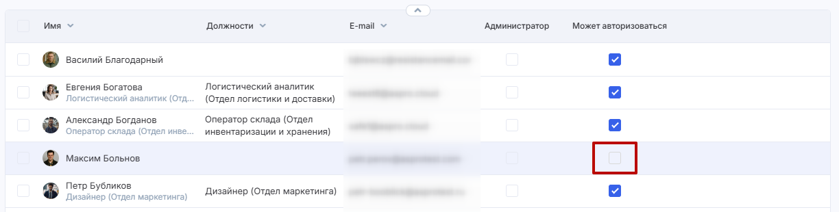 Например, если вы полагаете, что сотрудник еще может вернуться в компанию, вы можете просто заблокировать ему возможность заходить в систему без удаления аккаунта. Для этого в списке пользователей уберите галку с чекбокса «Может авторизоваться».