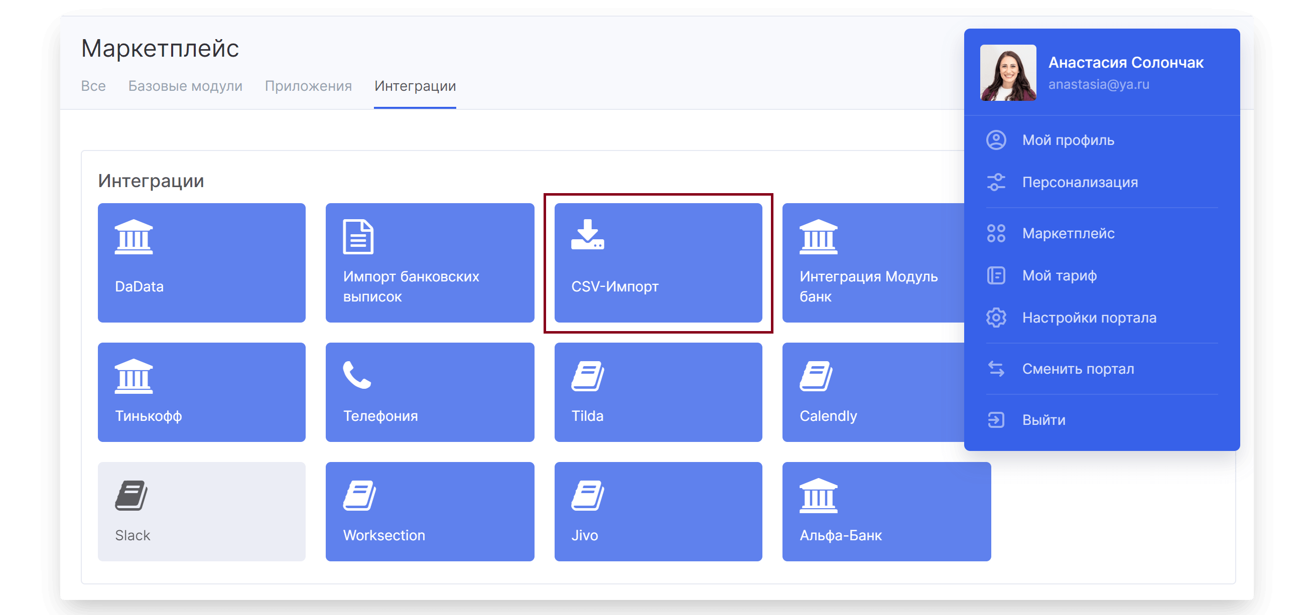 2. Перед началом импорта, проверьте, что в вашем аккаунте установлен соответствующий модуль CSV-импорта. Для этого перейдите в раздел «Маркетплейс» в левом меню. Его легко подключить, нажав на иконку и затем – кнопку «Подробнее».