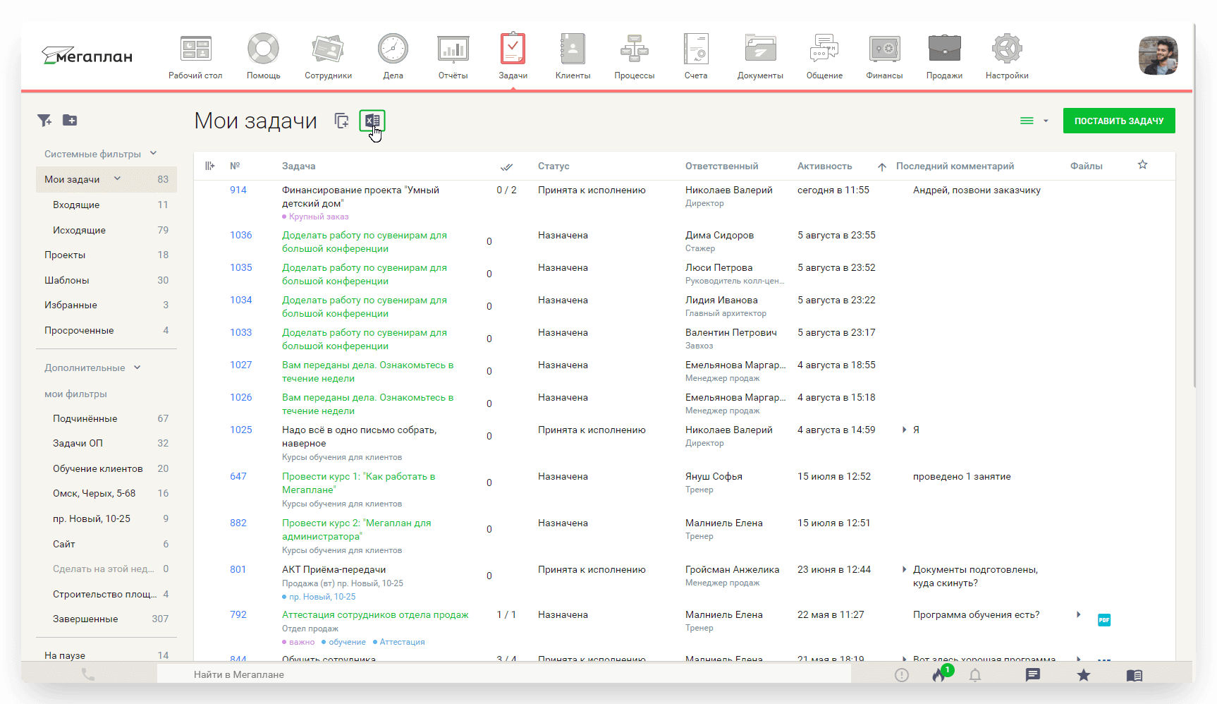Чтобы экспортировать задачи или проекты, нажмите на значок Excel рядом с названием раздела. Выгрузка будет идти в фоновом режиме. Уточняется, что экспортироваться будут только те данные, которые вы видите на экране. Вы можете применить фильтры и добавлять столбцы с дополнительной информацией в таблицу. Файл будет сформирован в формате XLS.