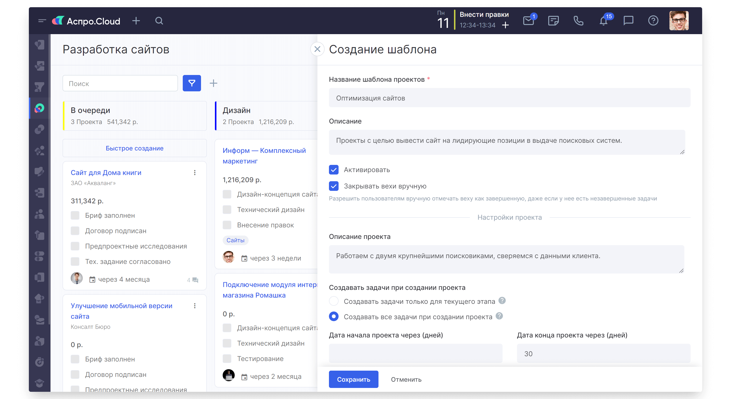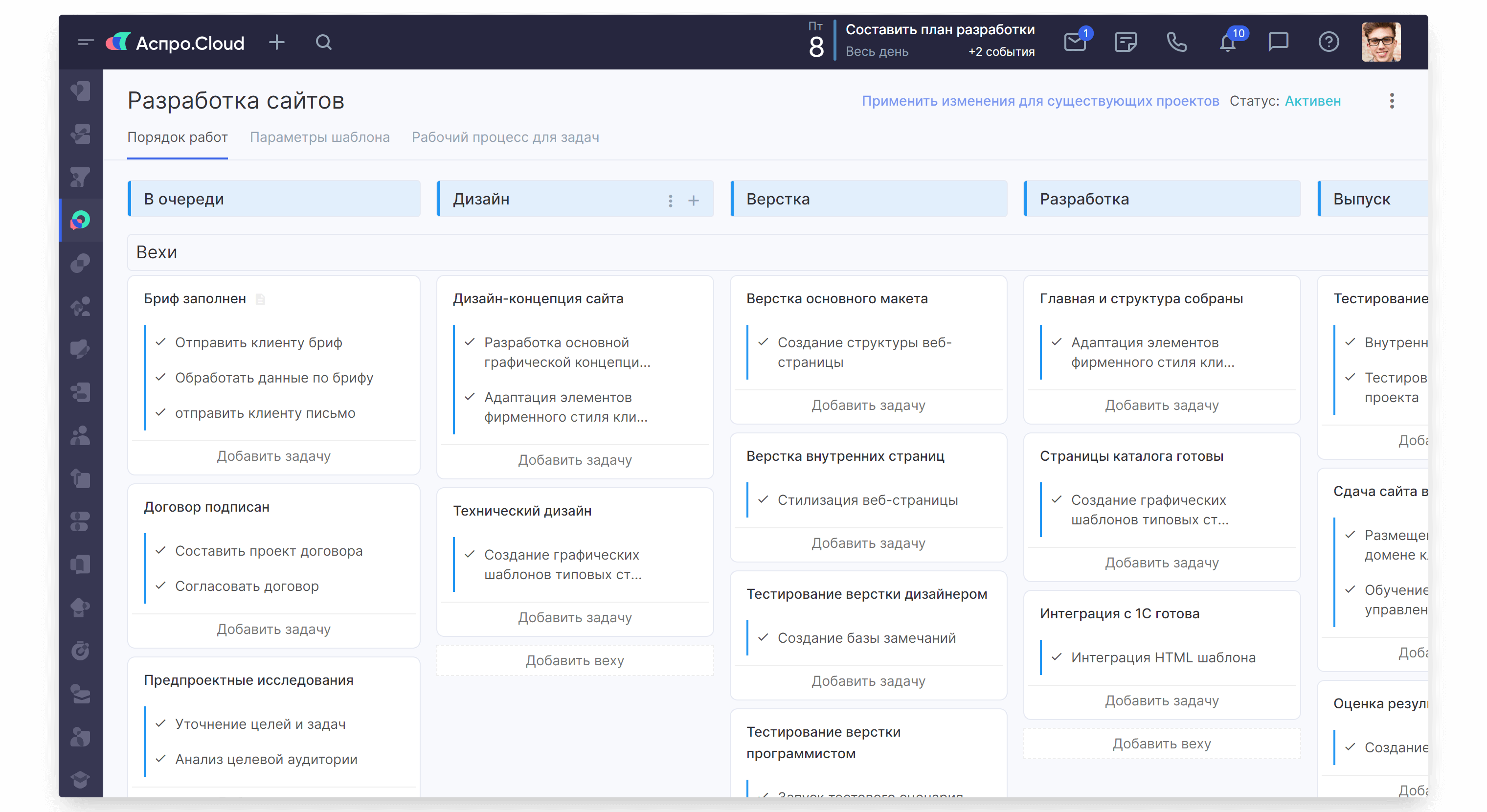 В Аспро.Cloud в любой момент можно изменить доску проектов, добавить новые этапы или удалить ненужные. Измененный чек-лист работ автоматически подтянется во все текущие проекты.