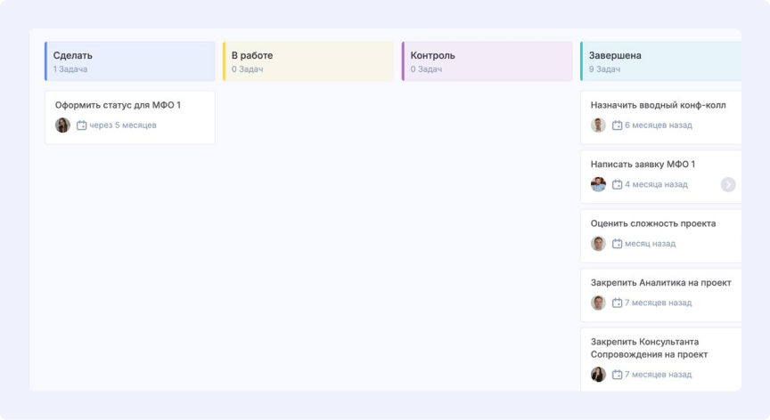 После того как сотрудники выполняют все необходимые задачи, а клиент получает меру господдержки или определенный статус, проект завершается. Следующий шаг — продажа услуги сопровождения. Этот процесс выстроен в рамках модуля CRM.