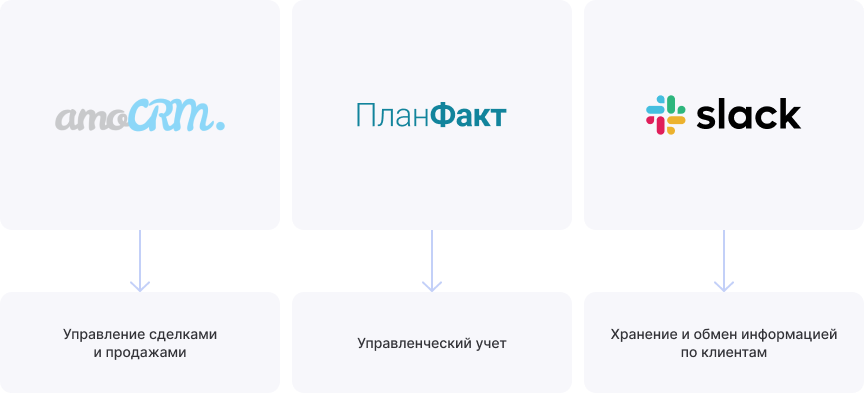 Также во время внедрения стало понятно, что для эффективной работы необходимо отказаться от amoCRM и Планфакта и объединить все процессы в одной системе.