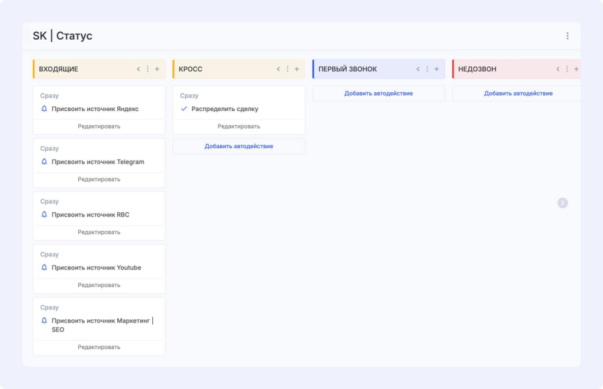 Так при создании проекта в карточке сразу настроены необходимые этапы и автодействия.
