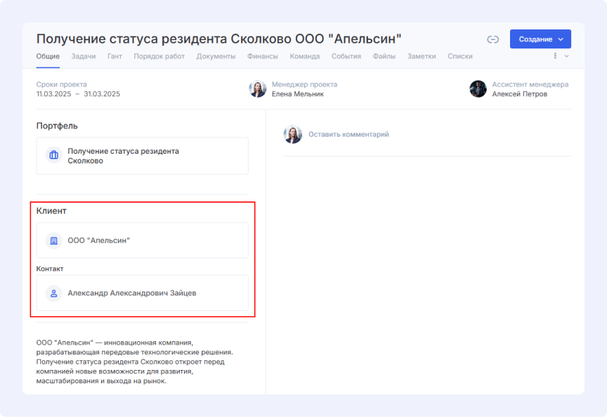 При переходе в новый отдел вся собранная информация по сделке и клиенту не теряется благодаря связям внутри проекта. Система автоматически подтягивает в проект карточку контрагента.