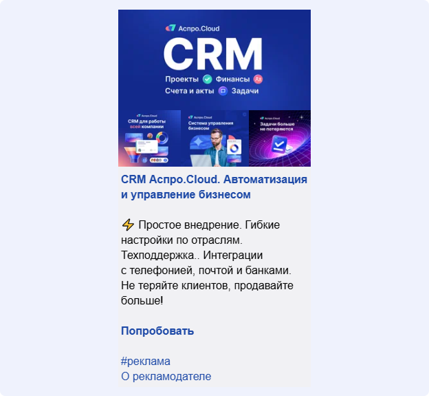 И только когда сегментировали аудиторию, подобрали узкие тематические паблики и написали оффер именно для конкретного сегмента, результат пошел. Люди в моменте еще не искали CRM, но это было касание и знакомство с продуктом. В итоге мы получили показы по 2 ₽, лиды в бота примерно по 60₽, что для медийного формата стало очень неплохим показателем. Были регистрации и оплаты с них, но тут уже хочется данные оставить в тайне.