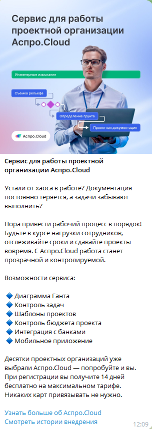 Точечная реклама на сегмент проектировочных компаний. Получили неплохие показатели по показам и переходам в бота, а также регистрации и оплаты.