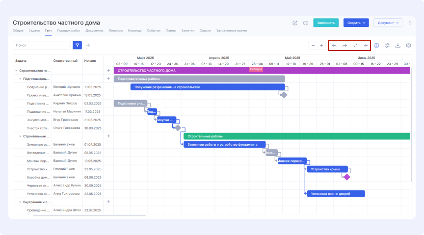 Критический путь — подсвечивает критические задачи, от выполнения которых зависит успех всего проекта. Подробнее о методе критического пути читайте в статье в нашем блоге.