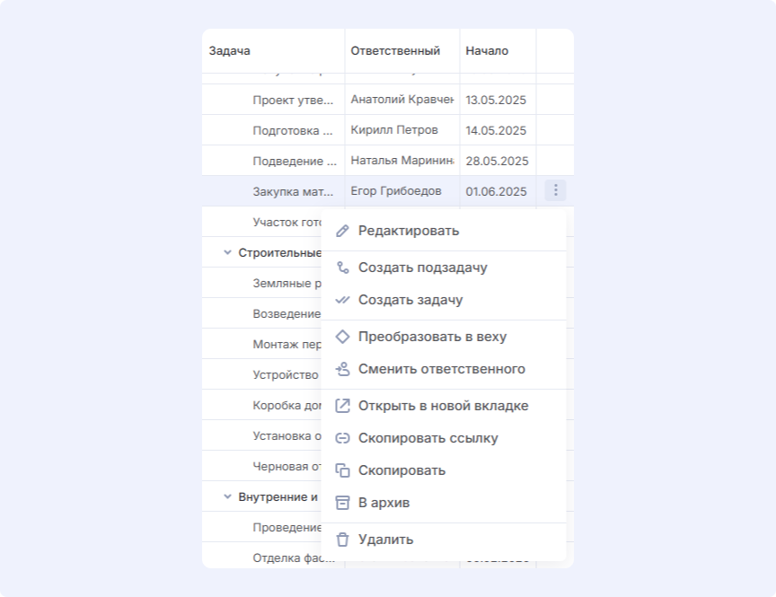Как на таймлайне задач, так в диаграмме Ганта внутри проектов, доступно новое меню управления задачами. Без перехода к детальной странице задачи можно оно позволяет, например: