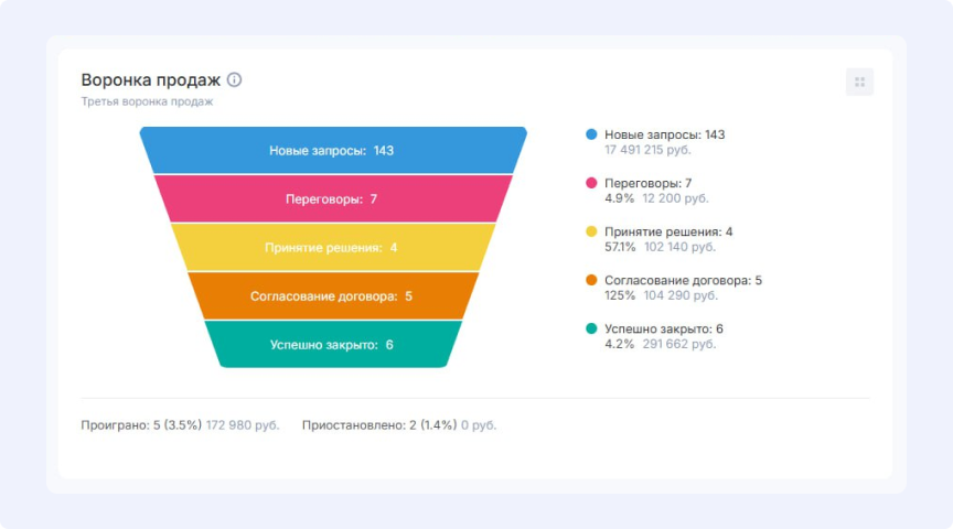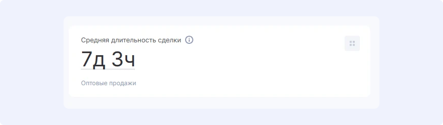 Отображает усредненное время существования в воронке или ее нахождения на отдельных этапах. Виджет поможет оценить эффективность работы отдела продаж.