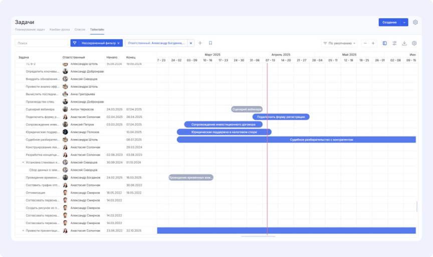 «Таймлайн» — новый вид представления в модуле «Задачи». Он отображает в форме диаграммы все проектные и внепроектные задачи. Таймлайн позволяет: