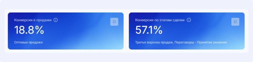 Виджеты «Конверсия в продажи» и «Конверсия по этапам сделки» позволяют отслеживать эффективность работы ваших менеджеров. В зависимости от выбранного типа виджета, вы сможете узнать: