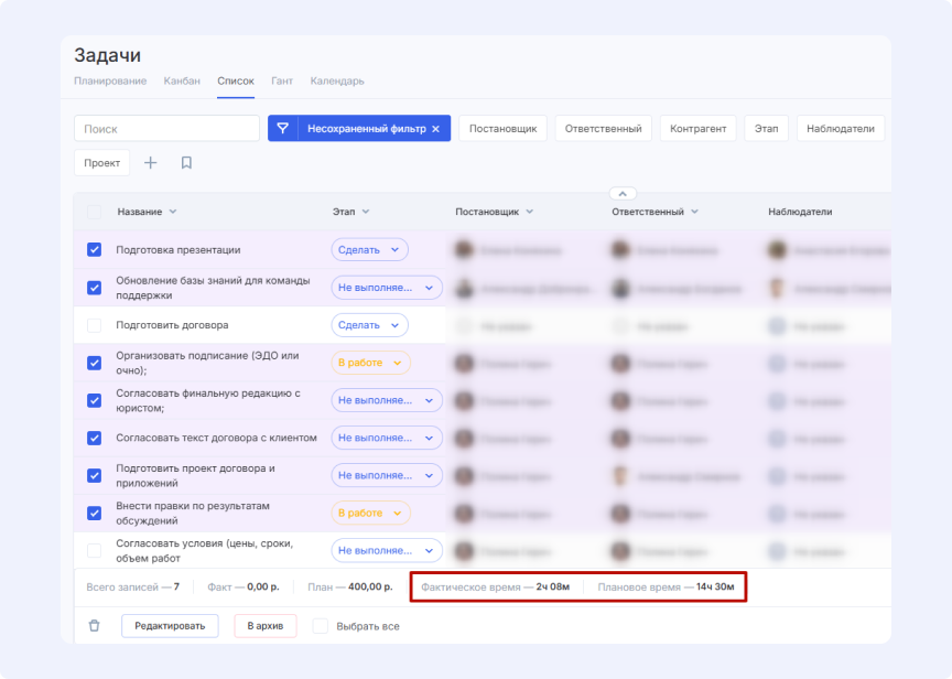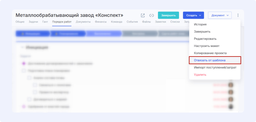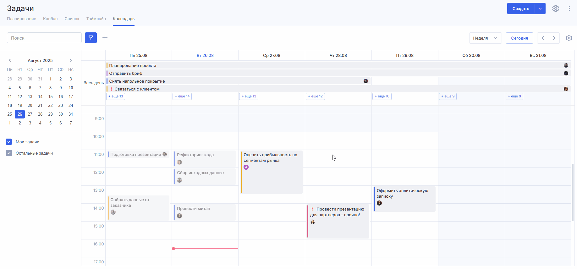В модуле «Задачи» появился еще один вид отображения задач — «Календарь». Он поможет составить расписание работы на день, неделю или месяц. В календаре учитывается заданное время выполнения задач и то, как они стыкуются между собой.Отвязка проектов от шаблона