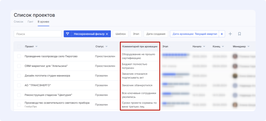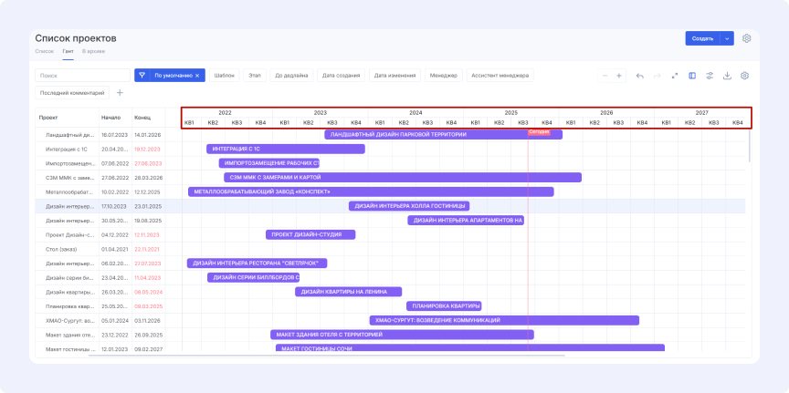 Переработали масштаб в диаграмме Ганта по проектам: разделили годы на кварталы. Теперь на одном экране помещается больше проектов, а вам будет проще планировать работу в долгосрочной перспективе.