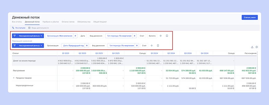 В отчетах ДДС и ПиУ теперь можно сравнивать разные периоды — по месяцам, кварталам и годам. Вы также сможете параллельно сравнить финансовые результаты разных организаций.