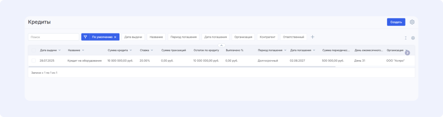 Модуль «Кредиты и займы» доступен на тарифах «Команда» и выше. Подробнее о работе с модулем читайте в документации.
