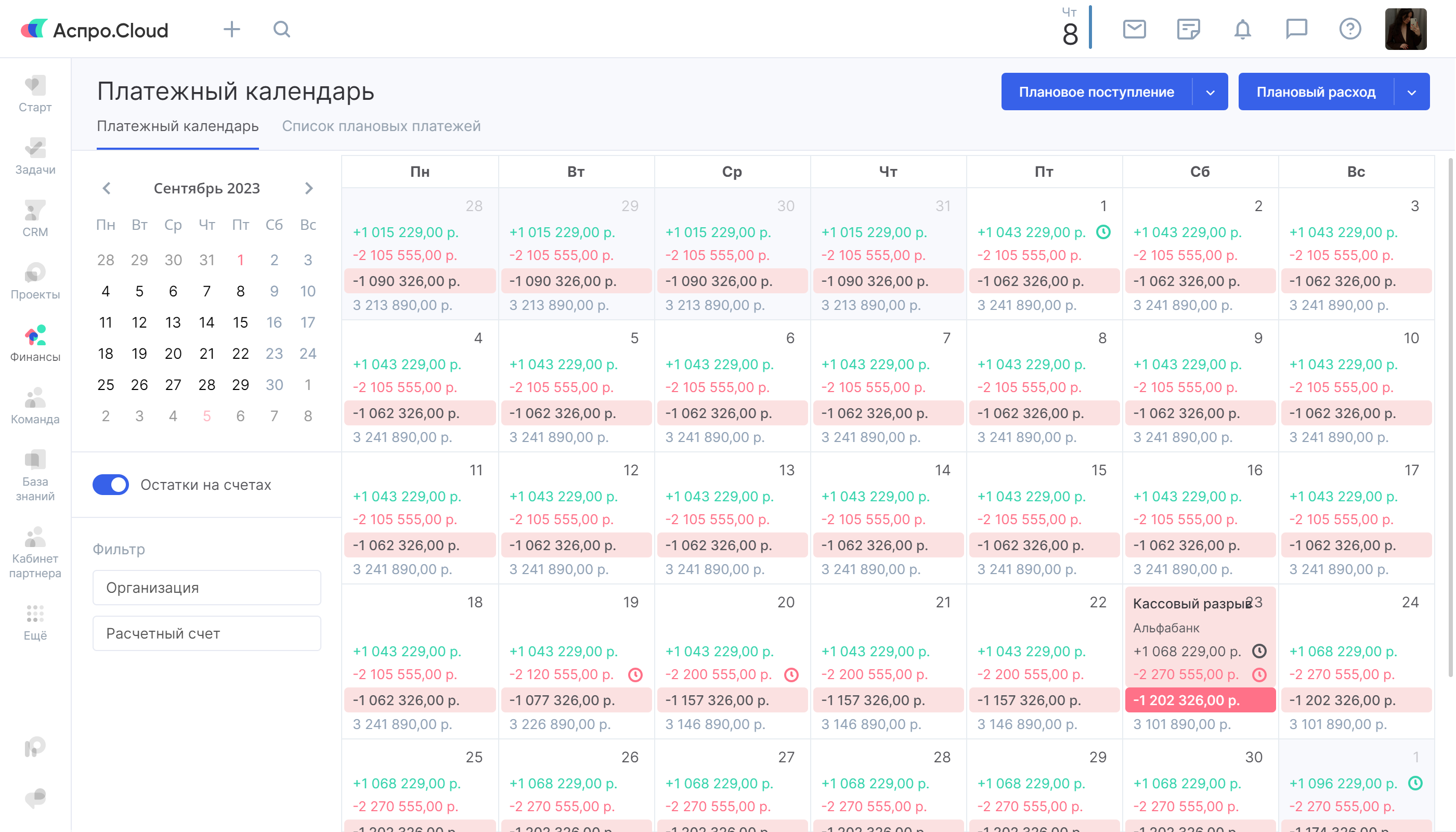 ПК позволяет компании оперативно планировать денежный поток в краткосрочной перспективе и не допустить кассового разрыва. На календаре вы увидите, в какой день и сколько вам необходимо заплатить по своим обязательствам, сколько поступлений будет в определенный день, а также остатки по счетам.