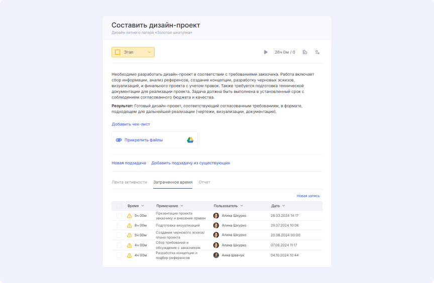 Есть еще один способ выявить такие случаи: добавить в задачу планируемое время, если примерно понимаете объем работ. А затем сравнить с фактическими показателями. Для этого система автоматически собирает отчеты. Например, в рамках одного проекта: