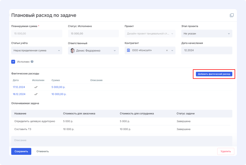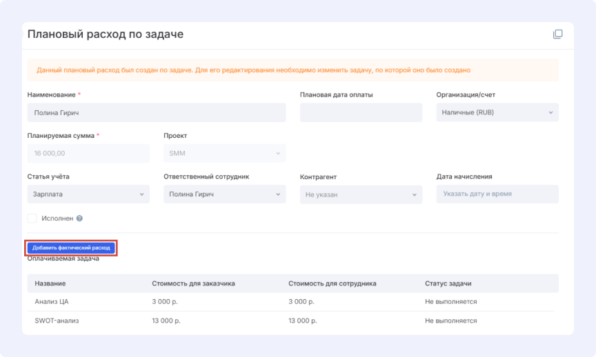 Для этого достаточно вручную создать задачу в проекте. По ее завершении система рассчитает стоимость задачи и создаст дополнительный плановый доход и расход во вкладке «Финансы».