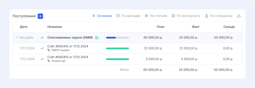 После того, как вы отправили счет и получили оплату, система автоматически создаст фактическое поступление в карточке проекта.